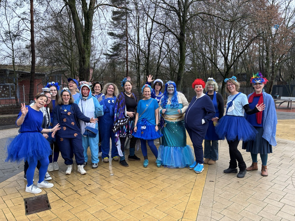 Ein Hingucker war unser Kollegium: Passend zu einem gemeinsamen Motto hatte sich das gesamte Team in der Farbe Blau verkleidet.