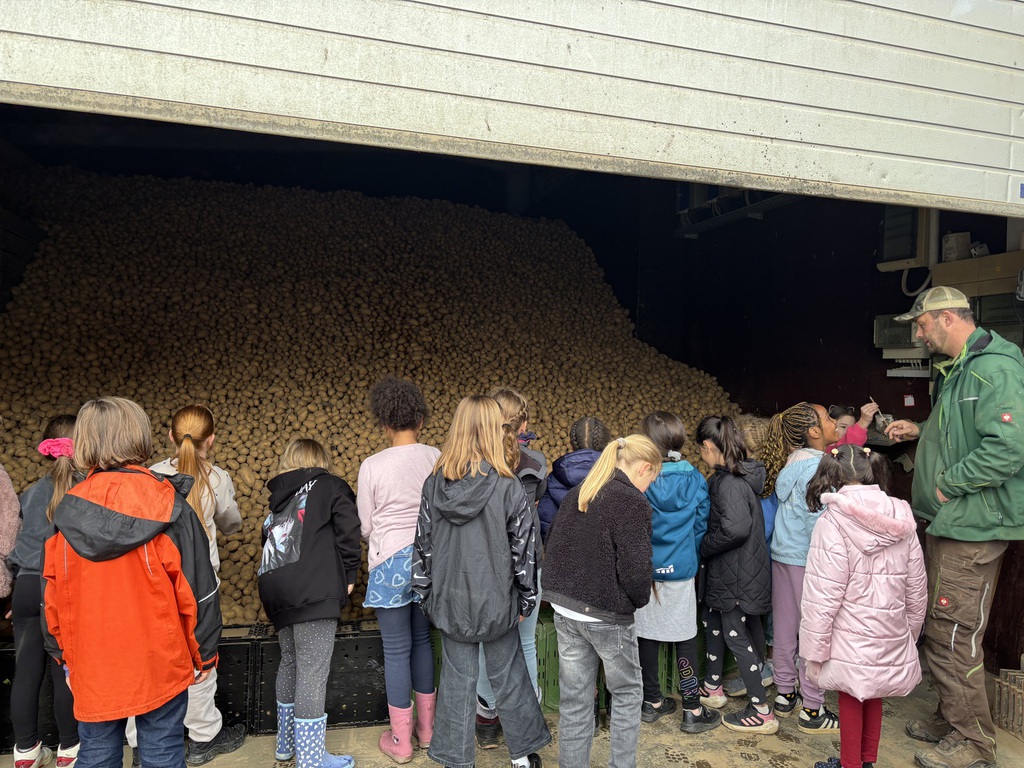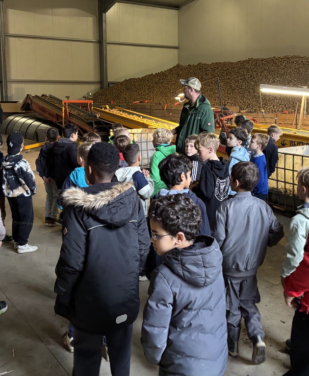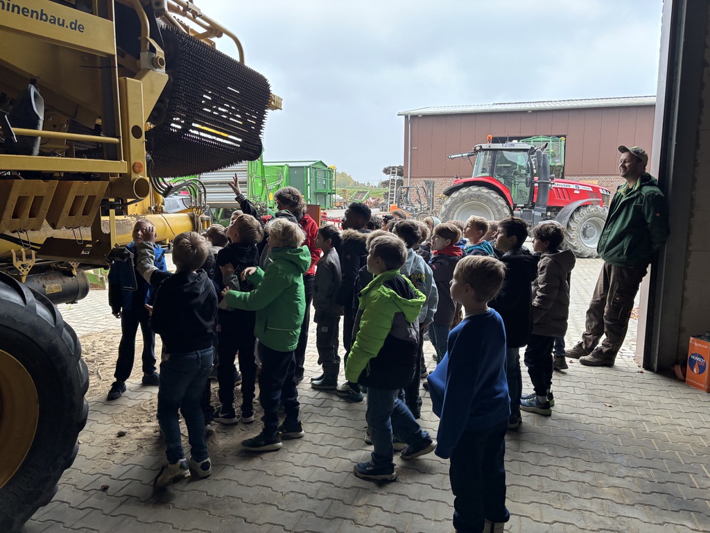 Die Klassen 3a und 3b durften heute einen ganz besonderen Ausflug erleben: Es ging auf den Kartoffelhof von Bauer Peter Friesen!